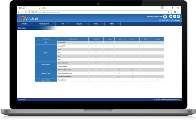 Quadrant is an integrated system that enables your organization to manage quality issues in clinical and safety operations to enhance efficiencies in process by improving productivity, reducing workload, ensuring compliance and reducing overall costs by centralizing and integrating key quality processes globally.