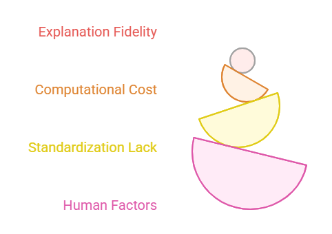 • Explanation fidelity issues mean XAI techniques provide approximations that may not perfectly represent actual model reasoning.